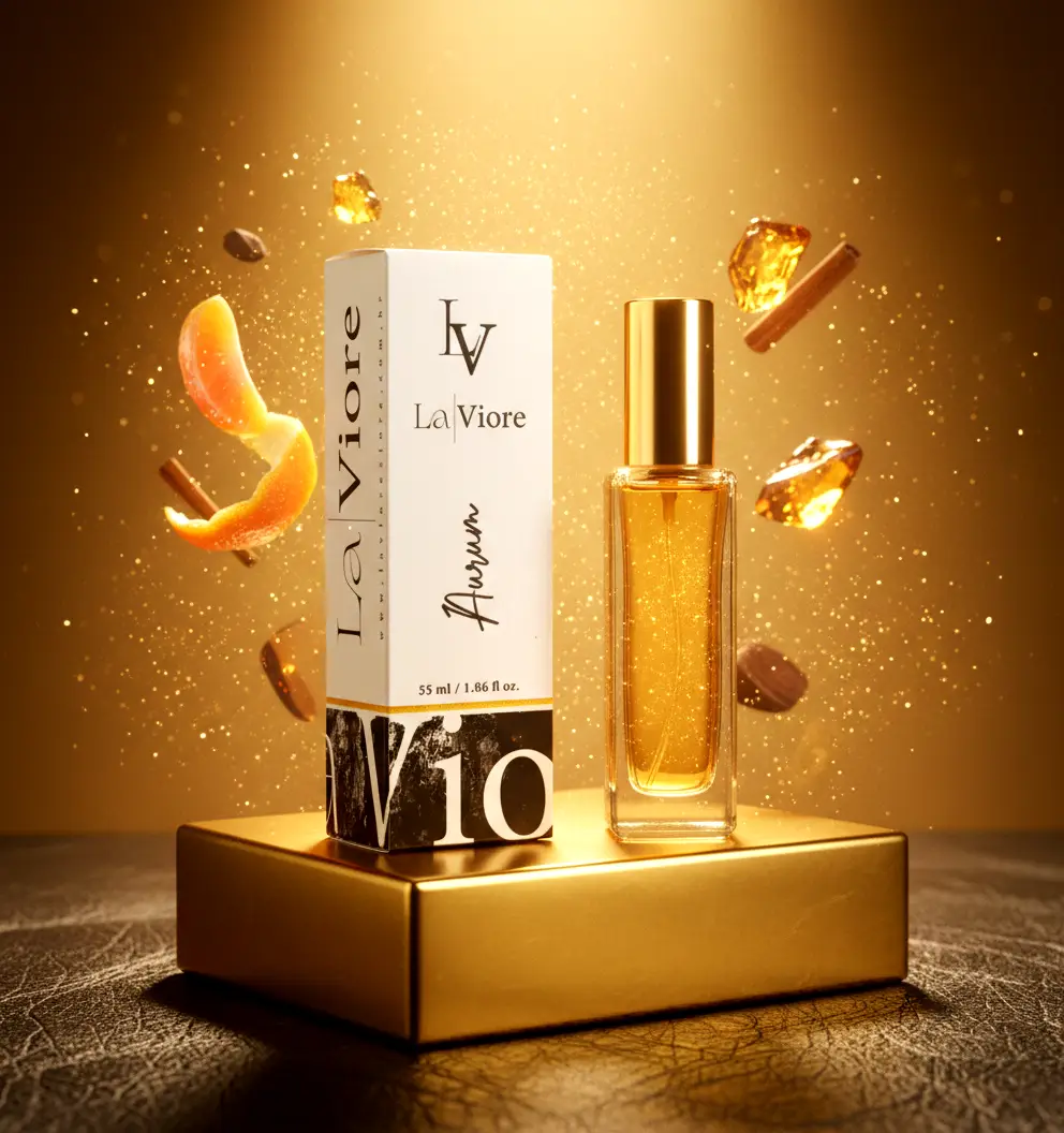 Aurum La Viore traduz o espírito do ouro em forma de fragrância: opulência, carisma e poder de atração. A abertura vibra com a energia cítrica da toranja e da mandarina, criando um impacto luminoso que chama a atenção desde a primeira borrifada. No coração, a canela se destaca cremosa e picante, envolta por especiarias quentes que acrescentam dimensão e magnetismo ao acorde. O desfecho é puro requinte: âmbar envolvente, couro sofisticado e madeiras nobres constroem uma base densa e persistente — um rastro que imprime presença e autoconfiança por horas.